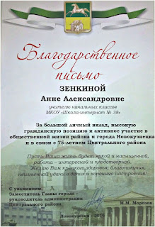 2021 г.- благодарственное письмо платформы Учи.ру благодарит за помощь в проведении всероссийской онлайн-олимпиады Учи.ру по экологии 1-9 классов.2016 г. - благодарственное письмо администрации Центрального района г. Новокузнецка "За большой личный вклад, высокую гражданскую позицию и активное участие в общественной жизни района и города Новокузнецка и в связи с 75-летием Центрального района."